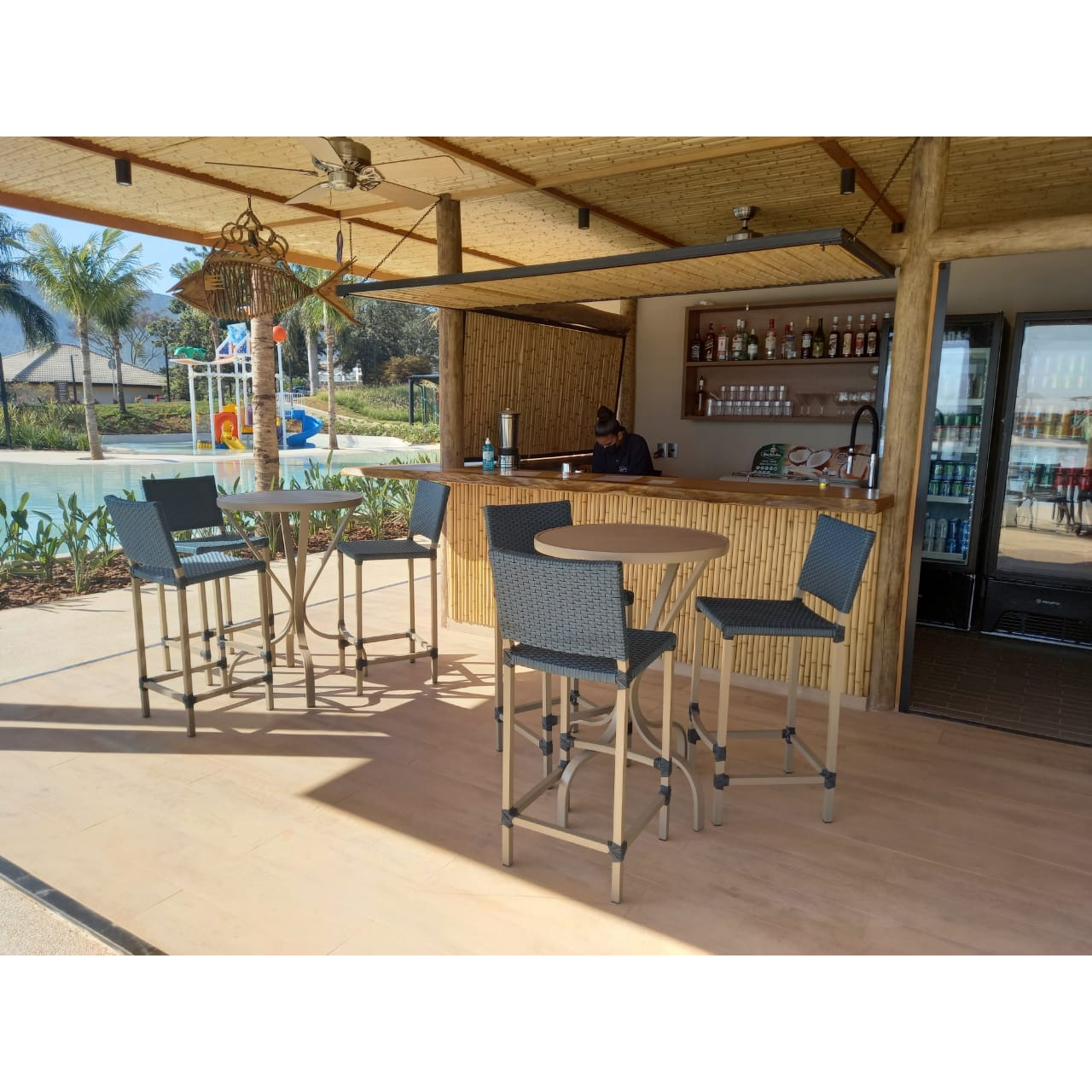 Estrutura de alumínio com solda estrutural, acabamento em pintura eletrostática e revestimento em fibra sintética (assento e encosto). Várias cores.