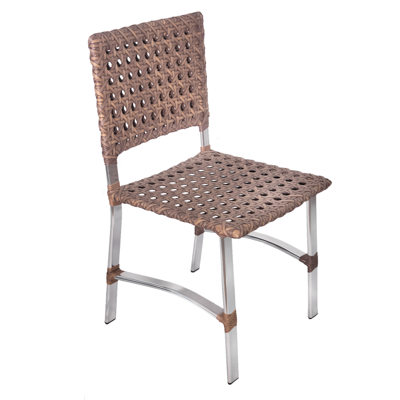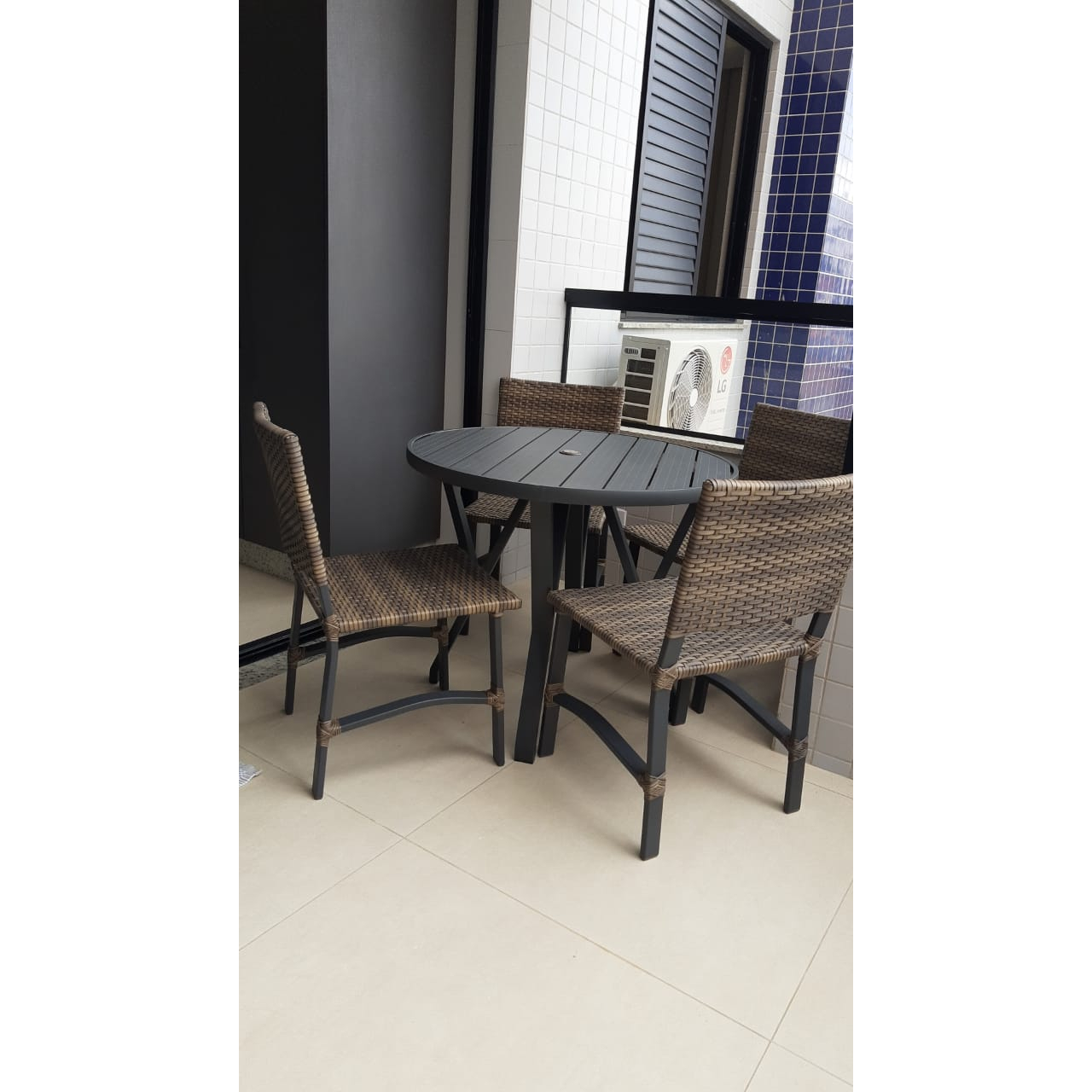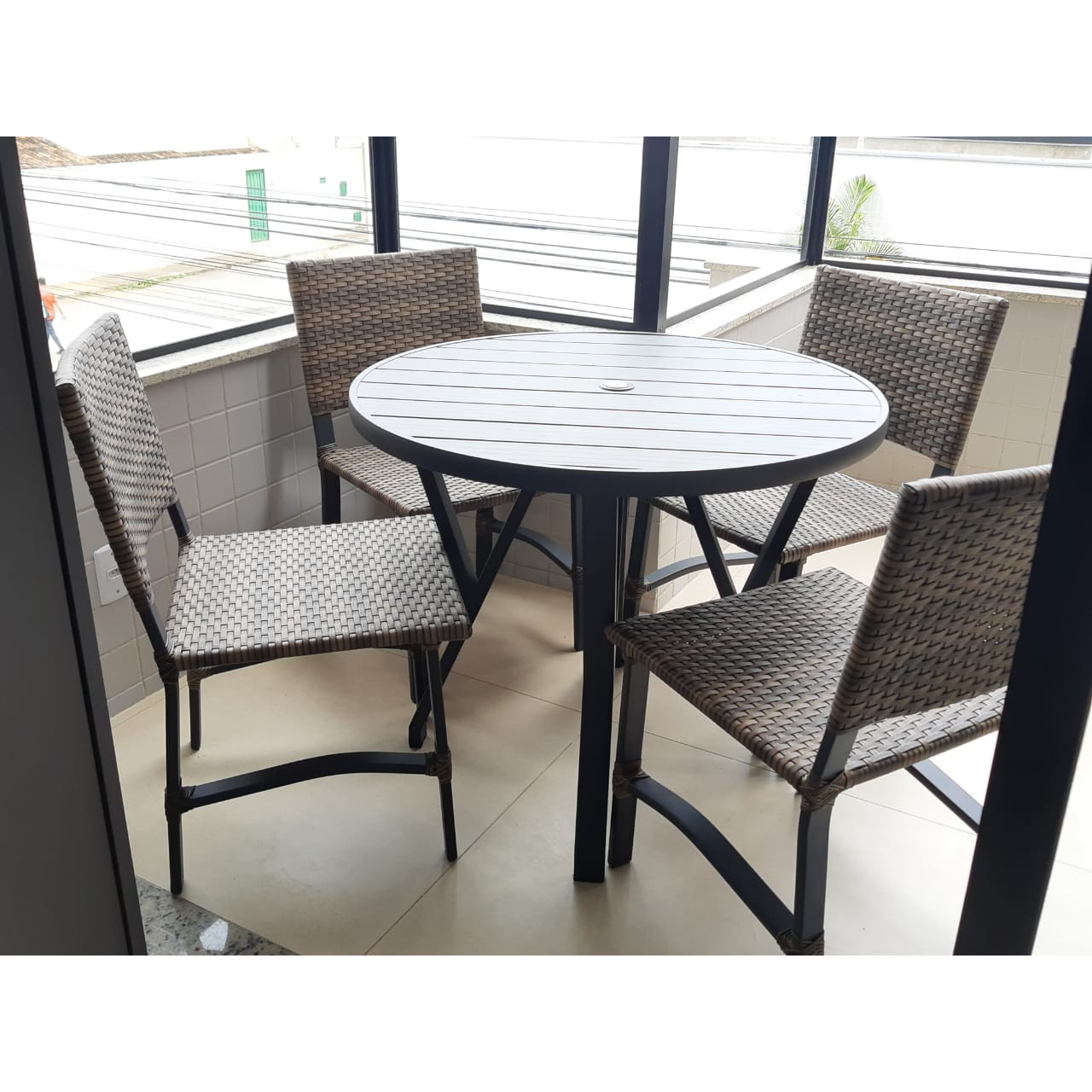 Armação de alumínio soldado com acabamento em pintura eletrostática e revestimento em fibra sintética.