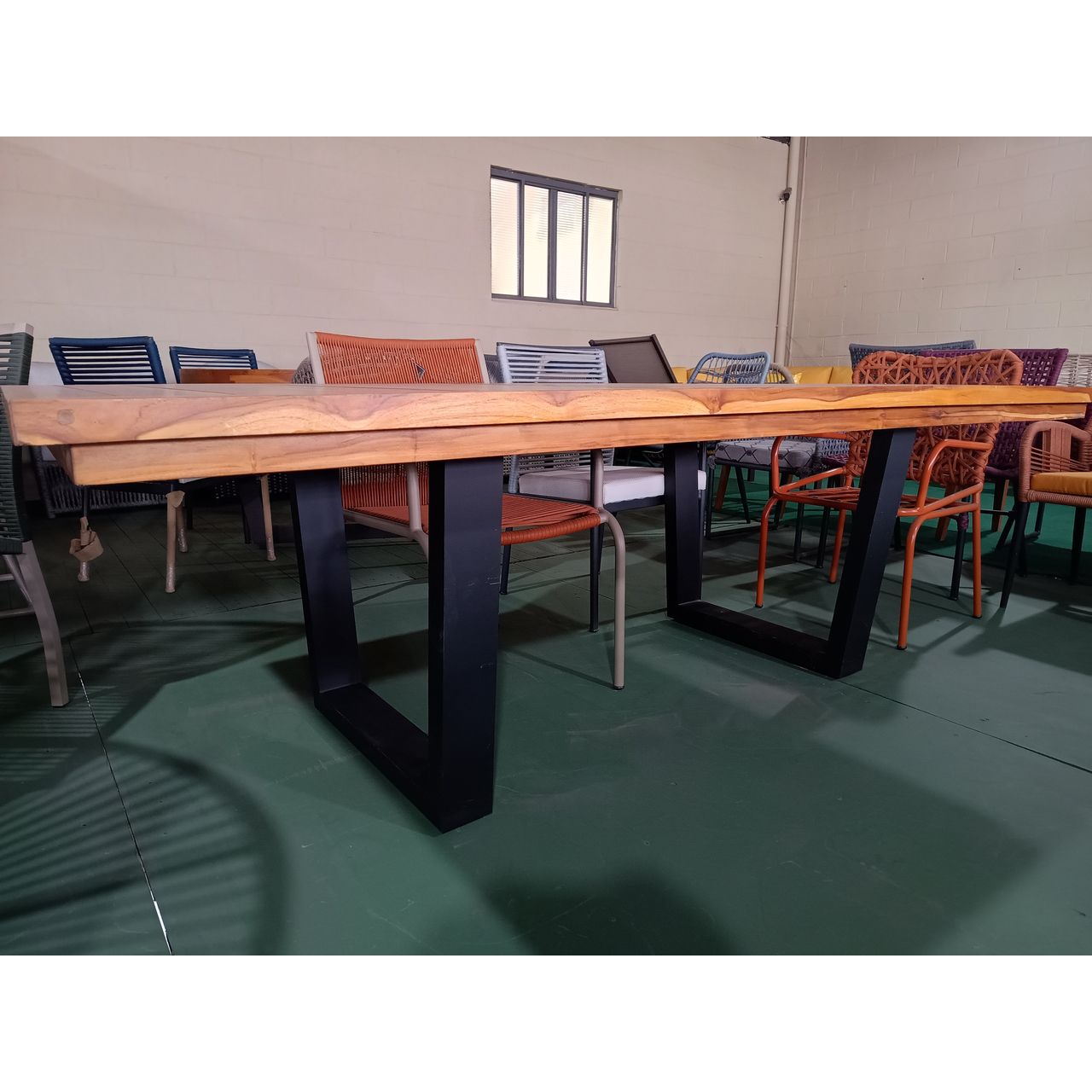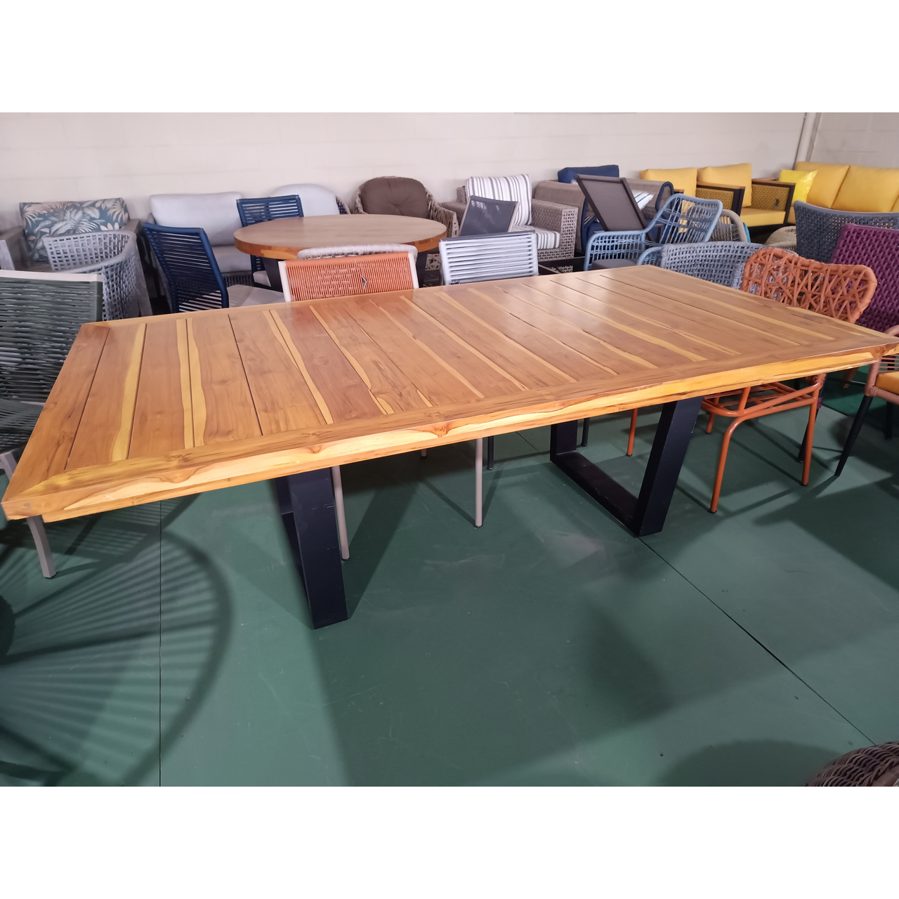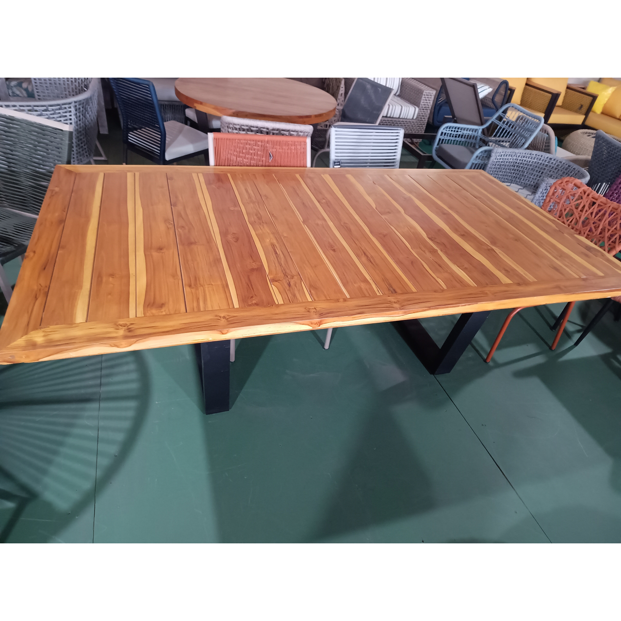 Mesa em Madeira maciça TEKA , toda ripada e emoldurada com pés em Aluminio.