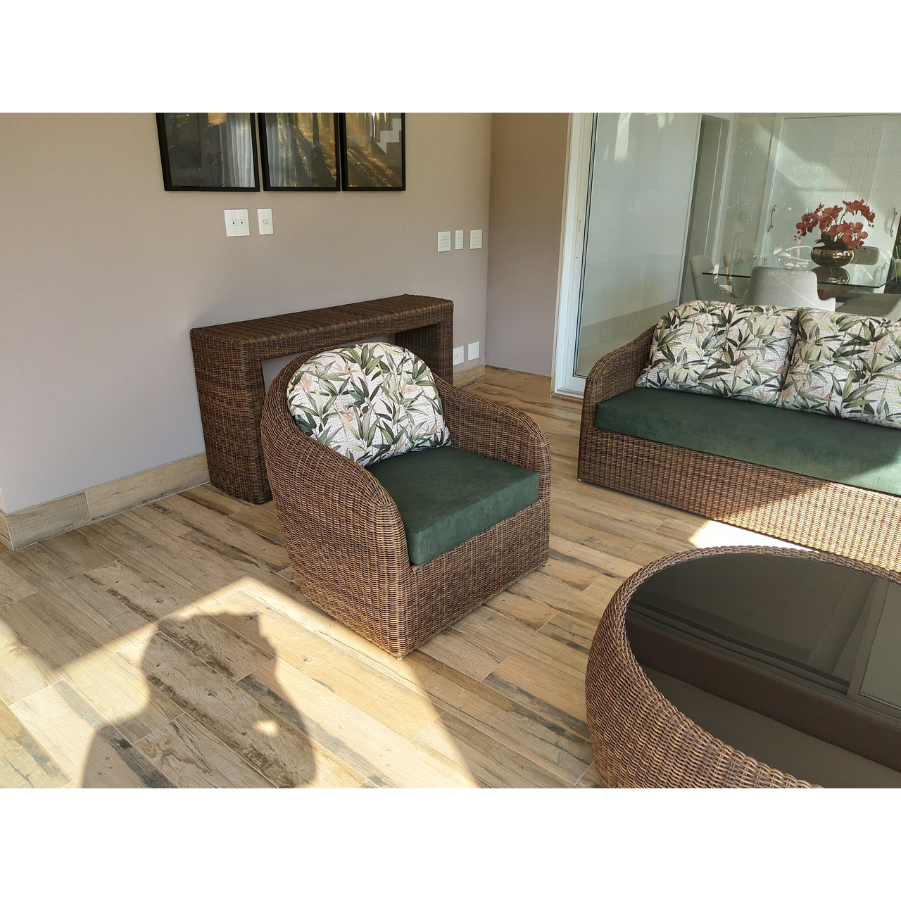 Armação de alumínio soldado com acabamento em pintura eletrostática e revestimento em fibra sintética.